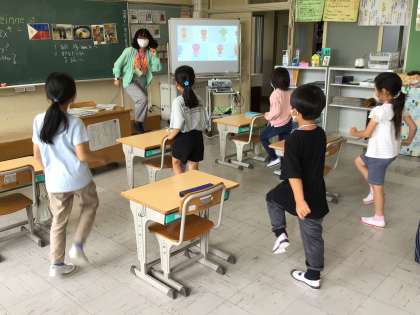 キーン先生の自己紹介を聞いてから、体を動かしながら英語を使ったエクササイズをしました。