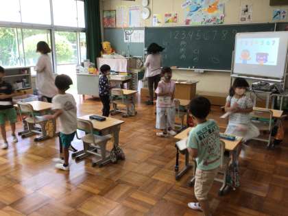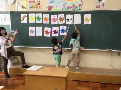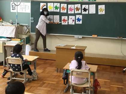 6/1 数や色を英語で言おう(1年生 外国語) 公開日 2021/06/01 更新日 2021/06/01 お知らせ 今日はALTのキーン先生が来てくれました。 はじめに、1〜10の数の言い方を歌に合わせて踊りながら覚えました。 次に、色の名前を勉強し、その後カードを使ってカルタとりゲームをしました。