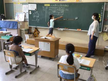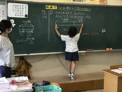 6/8 図を使って考えよう(2年生 算数) 公開日 2021/06/08 更新日 2021/06/08 お知らせ 「子どもがいました。9人きたので30人になりました。はじめに何人いましたか」という問題を考えています。 1年生のときはブロックを操作して考えていましたが、2年生になると扱う数が大きくなるのでブロックでは大変です。そこで、2年生からはテープ図を使った考え方を学びます。それぞれのテープが何を表しているのかを話し合いながら、解き方を考えました。
