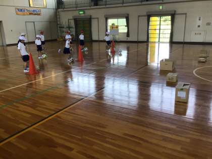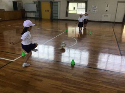 6/9 ボールけり遊び(1・2年生 体育) 公開日 2021/06/09 更新日 2021/06/09 お知らせ 1年生も、ボールを蹴る動作にも随分慣れてきました。 今日は、少し離れたところにあるコーンの間を通すゲームや、段ボール箱の的当てゲームをしました。 2年生の中には、インサイドキック(足の内側で蹴る方法)でコントロールよく蹴ることができる子もいました。