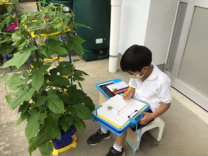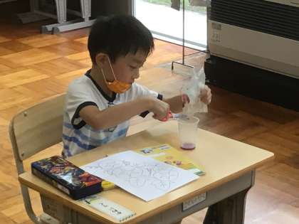 7/6 アサガオを育てよう(1年生 生活科) 公開日 2021/07/06 更新日 2021/07/06 お知らせ 朝顔が大きくなり、支柱の高さを越えてしまいました(世話の仕方がよかったのかな?)。きれいな花もたくさん咲かせています。 今日は、観察が終わってから花を使って色水を作り、ぬり絵をしました。とてもきれいな紫の色水が取れました。