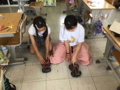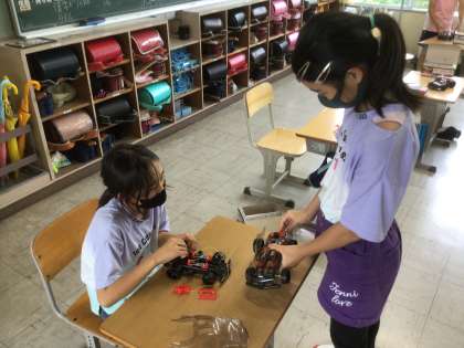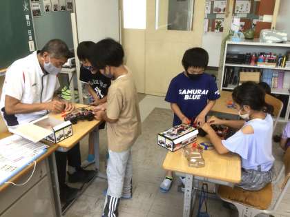 7/6 電池のはたらき(4年生 理科) 公開日 2021/07/06 更新日 2021/07/06 お知らせ 二つの乾電池とモーターを使って走るおもちゃを作っています。 「直列つなぎにしたから速いよ」 「直列つなぎは電池が早くなくなるから、並列つなぎにしよう」 「モーターだけじゃなく、豆電球もつくようにしよう」 「後ろ向きに進んじゃう!乾電池のつなぎ方を逆にしなきゃ…」 今までに学習したことを思い出しながら、思い思いにおもちゃ作りを楽しんでいました。