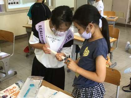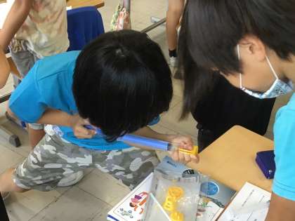 空気を押し縮めたり元に戻したりするのに合わせて、おもちゃが小さくなったり大きくなったりします。自分たちでも実験をして確かめました。不思議ですね…なぜでしょう?