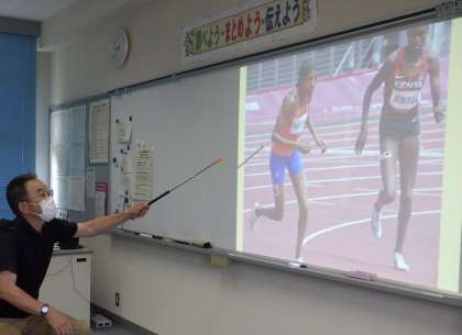 校長講話では、オリンピックやパラリンピックを通して勇気や感動を分けてもらえた一方で、せっかく練習をしてきたのに、コロナに感染したり濃厚接触者になったりしたため出場を辞退した選手がいることについて話しました。また、全国的に、そして豊田市内でも若者の感染者が増加していることを重く受け止め、学校で行っている予防に関する取組を徹底していこうと伝えました。