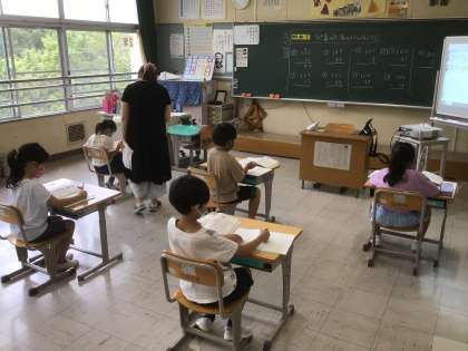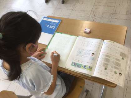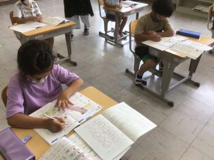 先生が黒板に書いた問題や計算ドリルの問題に集中して取り組みました。何度も繰り返したことで、かなり速く正確に解けるようになってきました。問題を解いている表情を見ても少し自信が湧いてきたようです。