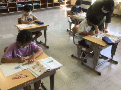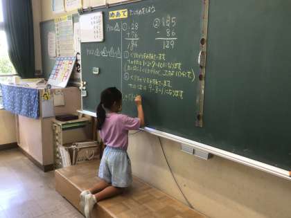 9/9 筆算の仕方を確かめよう(2年生 算数) 公開日 2021/09/09 更新日 2021/09/09 お知らせ 練習問題を解きながら、くり上がりやくり下がりのある計算の仕方を確かめました。 「まず一の位をたします。8+8=16なので、一の位に6を書いて、十の位に1と書きます。次に十の位をたします。5+8+1=14なので14と書きます。答えは146円です」 と、すらすら説明ができていました。今までに何度もくり返し練習をしてきた成果が身についているようです。