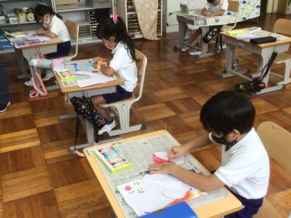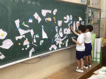9/10 いろいろなかたちのかみから(1年生 図工) 公開日 2021/09/10 更新日 2021/09/10 お知らせ 画用紙を自由にチョキチョキ切って、黒板に貼りました。いろんな形をした紙を見て想像を膨らませ、組み合わせたり、色を塗ったりして作品を作りました。