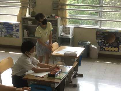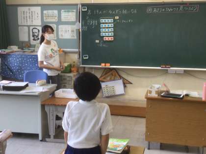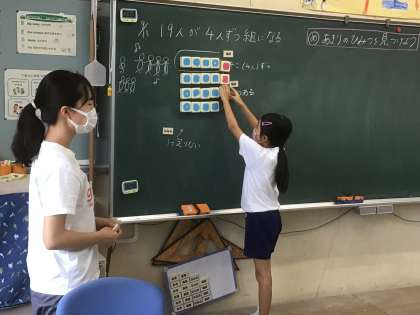 おはじきを操作しながら友達と考え「(あまりの)7人の中で、もう一つ組がつくれるから」と理由を発表することができました。わり算のあまりは割る数より小さくなるようにするということが分かりました。