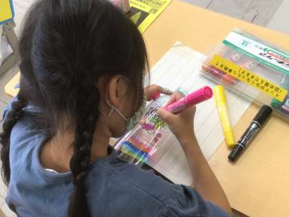 初めに、“きぼう“という言葉から連想するものを話し合ったところ、「夢、明るい、キラキラ、星、すごい、すてき、がんばる」などが出されました。この言葉を元に、一人一人がデザインを考えペットボトルをきれいに塗りました。
