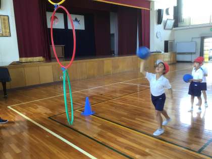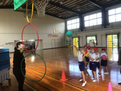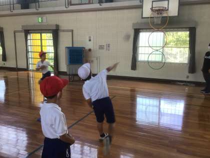 9/15 よーくねらって…(1・2年 体育) 公開日 2021/09/15 更新日 2021/09/15 お知らせ ボールを的をめがけて投げる運動の練習です。 バスケットゴールにぶら下がったフラフープにボールを通します。自分の力に合わせて、片手で投げたり両手で投げたり、上から投げたり下から投げたりします。 まずは、新聞紙を丸めた軽いボールで体の使い方を練習し、次にドッヂボールを投げました。慣れてきたら投げる位置を的から離していきます。離れても上手に輪を通せるでしょうか。