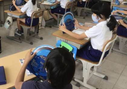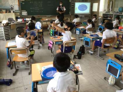 4年生は星の勉強をしています。星座早見盤の使い方やこぶしを使って星の高さ(高度)を図る方法を教えてもらいました。