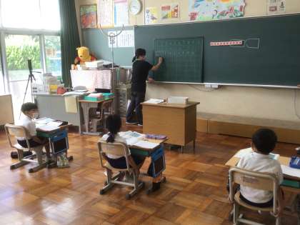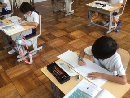 9/24 三つの数の計算(1年生 算数) 公開日 2021/09/24 更新日 2021/09/24 お知らせ 「バスにネズミが5ひきのっています。次に3びきのりました。その次に2ひきのりました。何びきになりましたか」という計算は、今まで 5+3=8 、 8+2=10 と二つの式に表していましたが、 5+3+2=10 という一つの式で表すようにします(頭の中では、5+3で8、8+2で10という計算をします)。 式の書き方を理解して、練習問題に取り組みました。