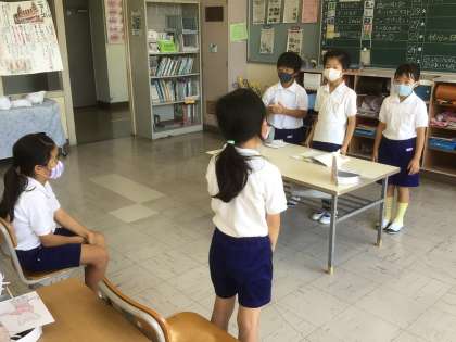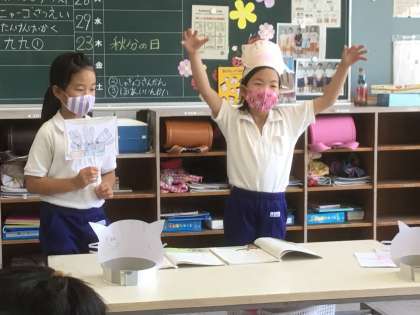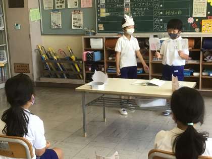 9/24 気持ちをこめて音読しよう(2年生 国語) 公開日 2021/09/24 更新日 2021/09/24 お知らせ 今日は、「ニャーゴ」の音読発表会をしました。 お面をかぶったり、ペープサートを使ったり、ジェスチャーを交えたりして登場人物の気持ちが見ている人に伝わるように演じました。今までの練習の成果を十分に出して元気に発表できました。 お互いに見せ合った後は、ビデオでも撮影して自分たちの音読を振り返りました。