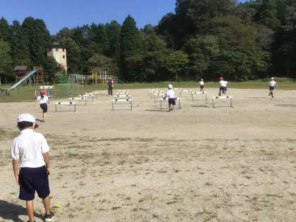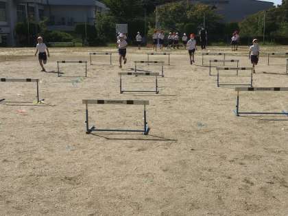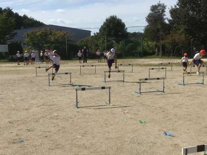 9/24 ハードル走(3・4年生 体育) 公開日 2021/09/24 更新日 2021/09/24 お知らせ 3・4年生の体育の授業は、今日からハードル走を行います。 アップ代わりのランニング走をした後、インターバル(ハードルとハードルの間隔)を3歩または5歩で走れるように、 自分に合ったハードルの間隔を3m50cm、4m、4m50cm、5mの中から探しました。