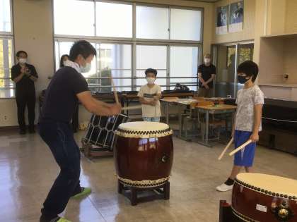 青木崇晃さん(本校出身の和太鼓演奏家)を講師に招いて、5年生が和太鼓の演奏体験をしました。