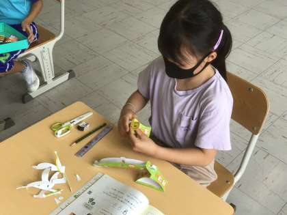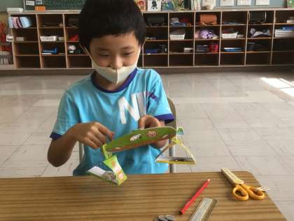 教科書の巻末付録のてんびんを組み立てて、筆箱の中に入っているものを乗せて重さ比べをしました。