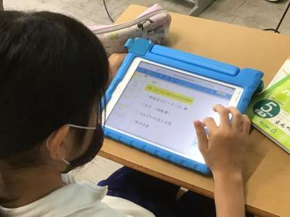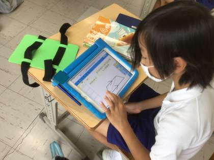 辺の長さや角の大きさが等しいことを記号を使って表したり、身の回りでどんな四角形を見つけたか文字で入力したりします。初めのうちは操作に慣れずに戸惑うこともありましたが、お互いに教え合いながらあっという間に操作方法を覚え、黙々と作業に取り組んでいました。