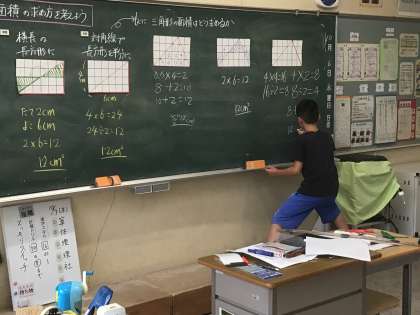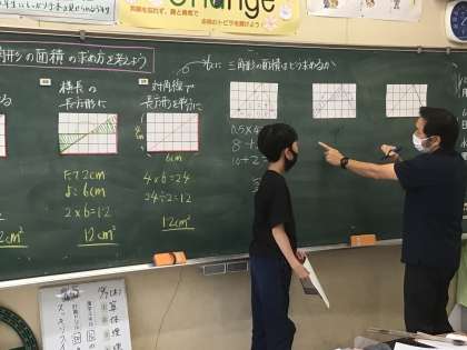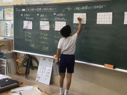 10/6 三角形の面積を求めよう(5年生 算数) 公開日 2021/10/06 更新日 2021/10/06 お知らせ 三角形の面積の求め方を考えて発表しました。 ・方眼を利用して、1㎠のマスがいくつ分あるか数える ・図形を移動して長方形に変形し、長方形の求積の公式を使う ・二つの直角三角形に分けたとき、それぞれが長方形の半分になっていることを利用する どの方法でも面積は求められます。形が大きくなったときや、方眼がないときにも使える方法が便利そうです。