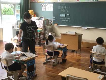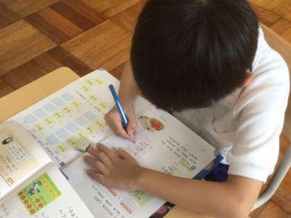 くり上がりのあるたし算の練習をしています。