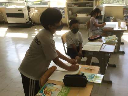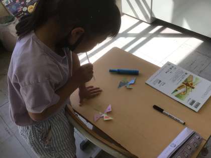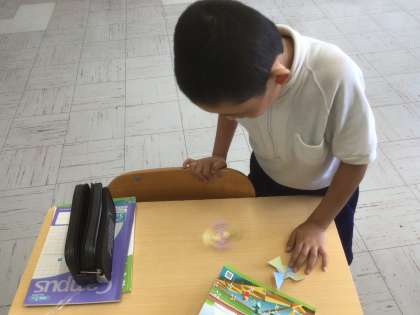 今日は身の回りにあるものを使って円を描く方法を考えました。ストローやコップの形に沿って鉛筆でなぞって描く方法を見つけたようです。でも、それだと円の大きさを自由に決めることができませんね。…次回「コンパス」の登場です。