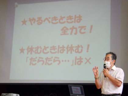 校長講話では、30cm跳ぶことができるノミを蓋をした箱に入れて10cmしか跳べない状態にして暫く置いておくと、蓋をとっても10cmしか跳べなくなってしまうという実験結果を例に挙げ、「普段から全力を出さず(出せず)にいると、いざというときに出したい力が出せない。だらだらした取組はやめて、やるときは全力を出し切り、集中できない時などはきちんと休むようにしよう」という話をしました。