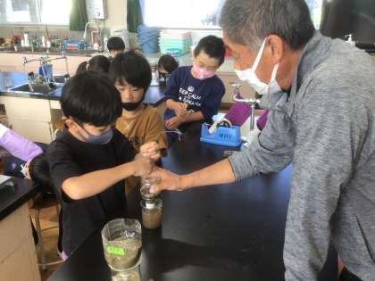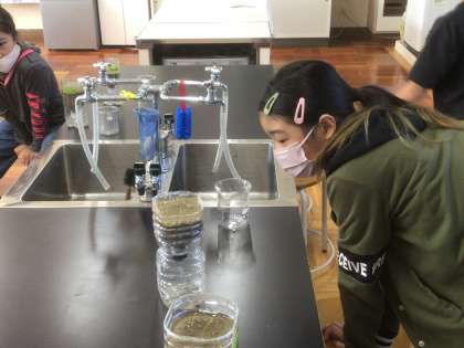 土の粒の大きさと水のしみ込み方の関係を調べます。ペットボトルに「運動場の土」「砂場の砂」「畑の土」「観葉植物の土」を入れてから水を流し、下から全て流れ出すまでの時間を比べました。