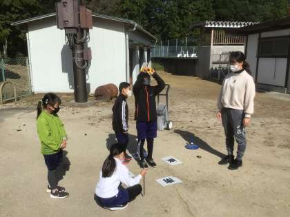 11/4 太陽はどう動く?(3年生 理科) 公開日 2021/11/04 更新日 2021/11/04 お知らせ 方位磁針を使って東西南北を調べ、地面にマークを置きました。 10時と12時に遮光板を使って太陽の位置を調べたところ、太陽は「東と南の間」から「南」に動いていました。 このことから14時の太陽の位置を「西の方」と予想を立てていました。さて、正解はどうだったのでしょう…?