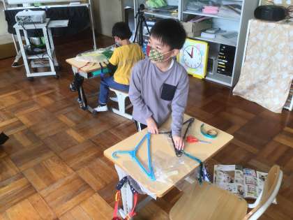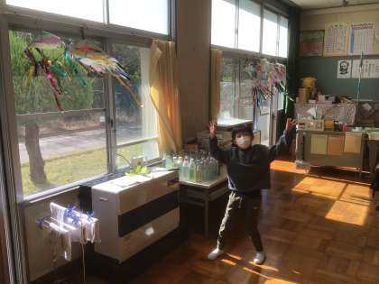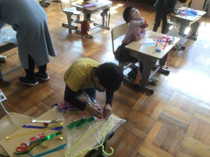 1年生は、図工の学習でハンガーやカラーテープ、ビニル袋を使って「ひらひらゆれる」きれいな作品を作りました。