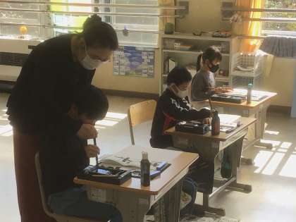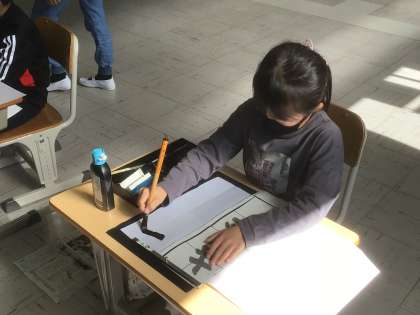 来月4日から10日は人権週間です。それにちなんで、今日の習字は「きずな」という字を書きました。点や画のつながりに気をつけて練習しました。