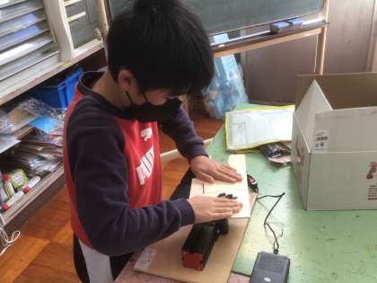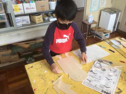 電動糸のこぎりを使って好きな形に板を切り,切った板を組み合わせて作品を作りました。以前にも,糸のこは使っているので、慣れた手つきで板を切っていました。