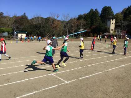 全校リレーでは、1年生から6年生までが4つのチームに分かれてバトンを繋ぎます。