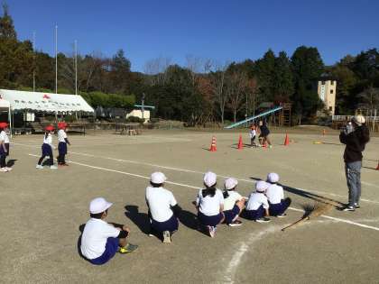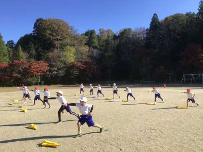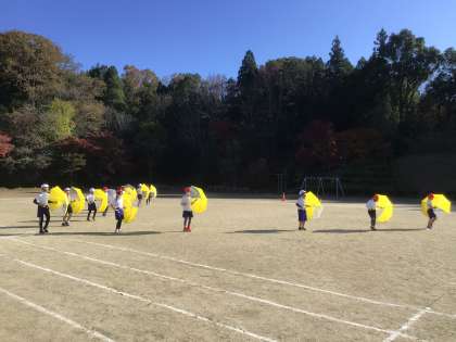 低学年は、親子競遊「ほうきにのって おおきくなあれ」とリズム「ジブリメドレー」の練習をしました。リズムについては子どもたちが優秀なので、傘をくるくる回すときに「移動する」のを加えることにしたようです。