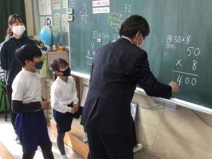 11/18 お客さんがきました 公開日 2021/11/18 更新日 2021/11/18 お知らせ 今日は豊田市教育委員会の山本浩司教育長が来校されました。 山本教育長は4代前の豊松小学校の校長です。久しぶりに校内を回り、溌剌と授業に臨む豊松っ子の様子に目を細めていました。 3年生の教室では、子どもたちと並んでかけ算の筆算の問題を解いていました(なかなかのお茶目さんです…)。
