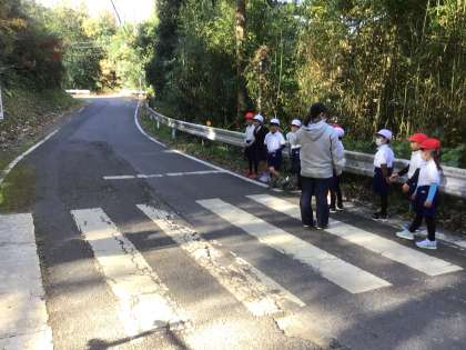 学校の北側斜面を降りた、県道361号線にある横断歩道付近が全学年共通のスタート地点です。