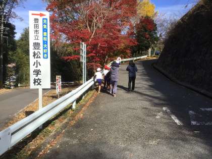 低学年は、豊栄橋で折り返し、スタート地点を通過して豊松小学校入口の坂を登ります。コースの最後に待ち受ける傾斜のきつい長い子の坂道を「地獄の坂道」と呼ぶんだと子どもたちが教えてくれました。坂道を上り切ってもうちょっと走るとゴールが待っています。