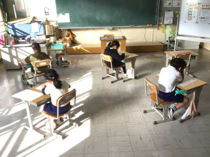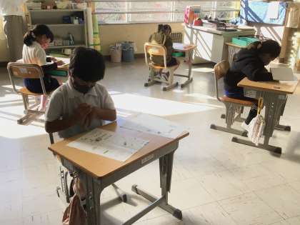 11/30 テストがんばってます(2年生 算数) 公開日 2021/11/30 更新日 2021/11/30 お知らせ 2年生の教室に入ると、4人がばらばらな方向を向いて座って「かけ算、九九」の復習テストをしていました。 いつもは賑やかな2年生ですが、さすがにテスト中はシーンとしています。テスト用紙を見ながら、「絶対に間違えないぞ!」という表情で真剣に取り組む様子もなかなかカッコいいですね。