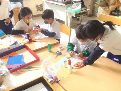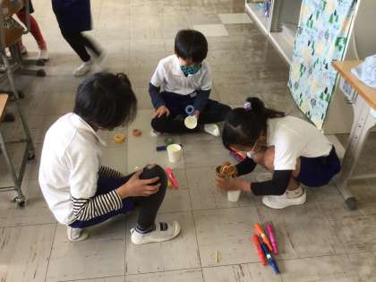 1年生は、2年生の話をよく聞きながら一つ一つ順におもちゃを完成させていきました。また、“自分でやってみせて、1年生が作るのを見守ったり手伝ったりしている“2年生の姿は立派なお兄さんお姉さんでした。