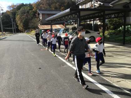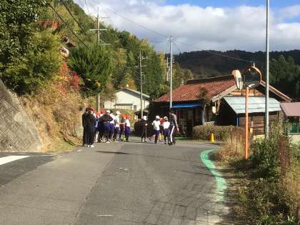 スタートして豊栄橋(低学年折返し地点)を越え、豊栄神社の下(中学年折返し地点)も通り過ぎ、坂上の簡易郵便局付近で折り返します。高学年も最後は「地獄の坂道」を登りきって運動場を約1周したらゴールです。