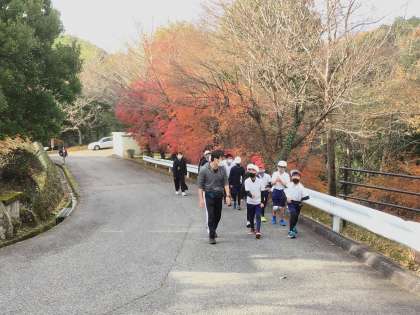 高学年のコースは約2,000mです。授業の初めに準備運動をしてから出かけた高学年ですが、坂を登りきった頃にちょうど授業終わりのチャイムがなりました。歩くだけでもそれなりの運動量はあります。
