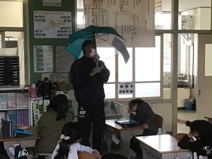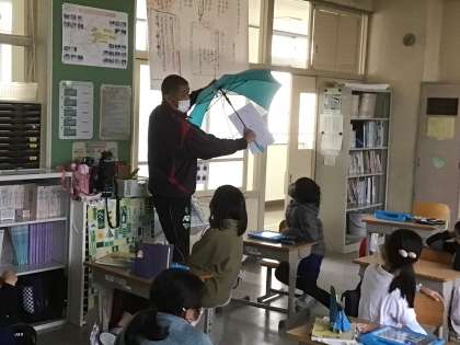 傘の裏側にオリオン座を貼り付け、傘を肩に担ぐようにして差します。そのまま、南の方角に身体を向けて、傘の持ち手部分を自分から見て時計回りに回すと、オリオン座が東から上り、南の空を通って西に沈むという動きが再現できます。