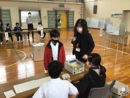 スライドを見ながら選挙がなぜ必要なのかという説明を聞いた後、模擬投票を体験しました。