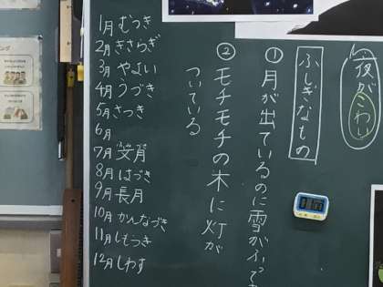12/13 今日は師走十三日 公開日 2021/12/13 更新日 2021/12/13 お知らせ 3年生が国語で勉強している「モチモチの木」に「霜月二十日」という表現があります。この「霜月」のような月の呼び方を和風月名というそうです。 黒板の端に12か月分の和風月名が紹介してありました。とりあえず、自分の誕生月は覚えたみたいです。