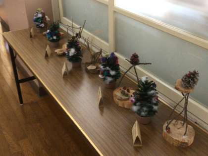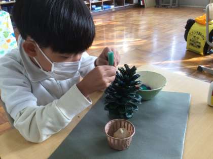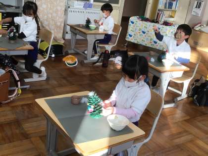 12/13 松ぼっくりツリー 公開日 2021/12/14 更新日 2021/12/14 お知らせ 1年生が、のびっこタイムに大王松の松ぼっくりを使ってクリスマスツリー作りをしました。 スプレーで色付けをした松ぼっくり、ラメ入り糊、綿などを使って上手に作りました。