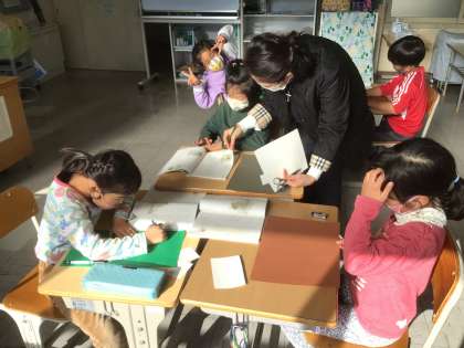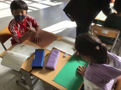 話に登場するかえるくんとがまくんのペープサート作りをしています。画用紙の色もちゃんと考えてます。