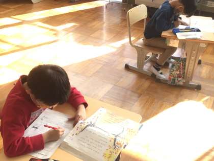 12/14 8か月たちました…(1年生 国語) 公開日 2021/12/14 更新日 2021/12/14 お知らせ 「おとうとねずみチロ」の話を読んで、場面ごとのチロの気持ちを考えています。 そういえば、ノートに書く文字のサイズが随分コンパクトになってきています。教科書や黒板の文字数も4月頃とは比べものにならないくらい増えました(一番下の写真は初めの頃の単元「あめですよ」)。カタカナや漢字も覚えました。 毎日見ていると気がつきませんが、日々成長しています。