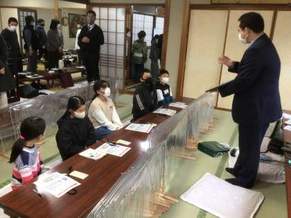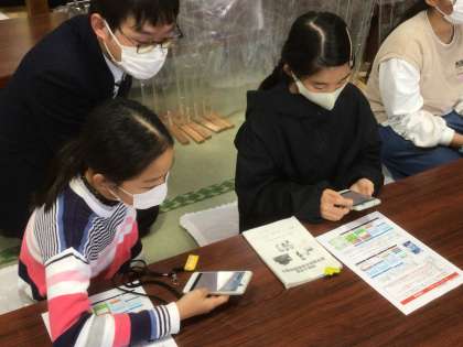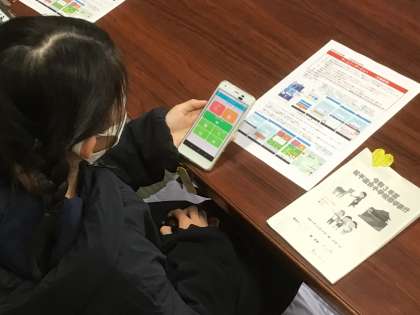 端末を持って奈良公園を歩き、クイズラリーをする「マチ探」をします。 班長が説明を受けています。