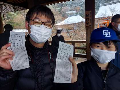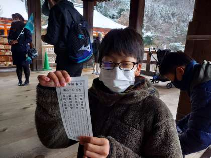 12/18修学旅行42(運試し) 公開日 2021/12/18 更新日 2021/12/18 お知らせ おみくじを引きました。 見事に大吉を引き当てた子がいましたが、残念ながら「凶」を出した子もいました。おや、先生も「凶」だったようです。きっと、不幸はみんなで分け合いなさい…ということですね。