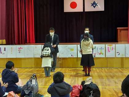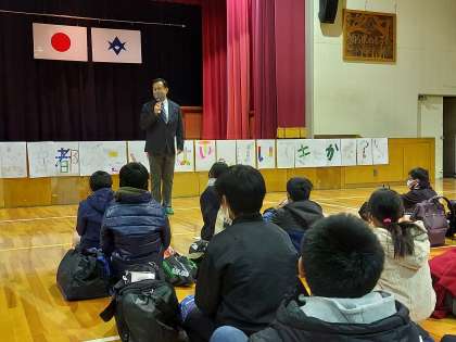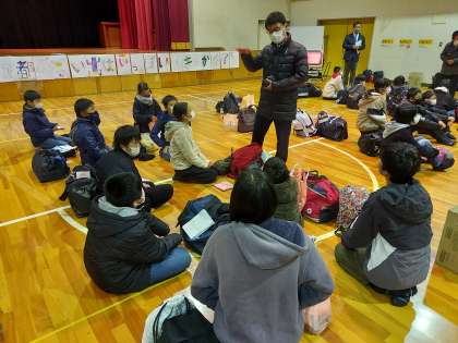 今回の連合修学旅行の取りまとめをしてくださった滝脇小・石黒校長先生の挨拶では、旅行中に見られた各校のよかった点が紹介されました。豊松小は狐面作りに丁寧に真剣に向き合っていた様子が印象的だったと褒めていただきました。