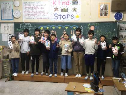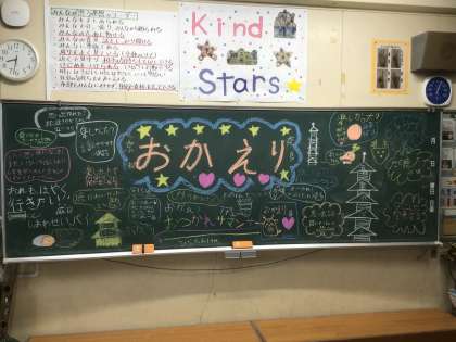 6年生が5日ぶりに登校すると、黒板におかえりメッセージが書かれていました。気持ちがほっこりしますね。メッセージの前で、旅行中に作ったお面を持って記念撮影しました。