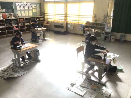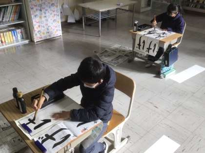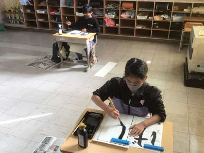 1/7 書き初め大会(3年生) 公開日 2022/01/07 更新日 2022/01/07 お知らせ 3年生以上は毛筆です。墨をつけて、筆先を整えながら集中力を高めます。 3年生の課題は「げんき」です。